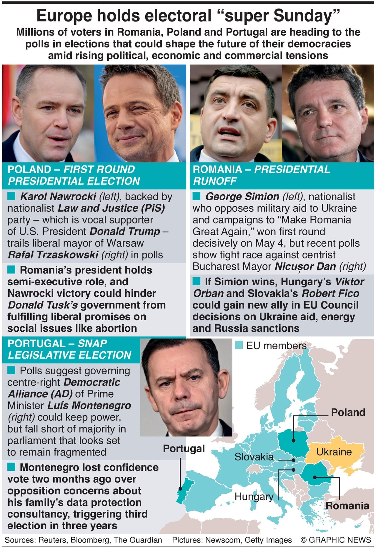Millions of voters in Romania, Poland, and Portugal are heading to the polls in elections that could shape the future of their democracies amid rising political, economic, and commercial tensions.