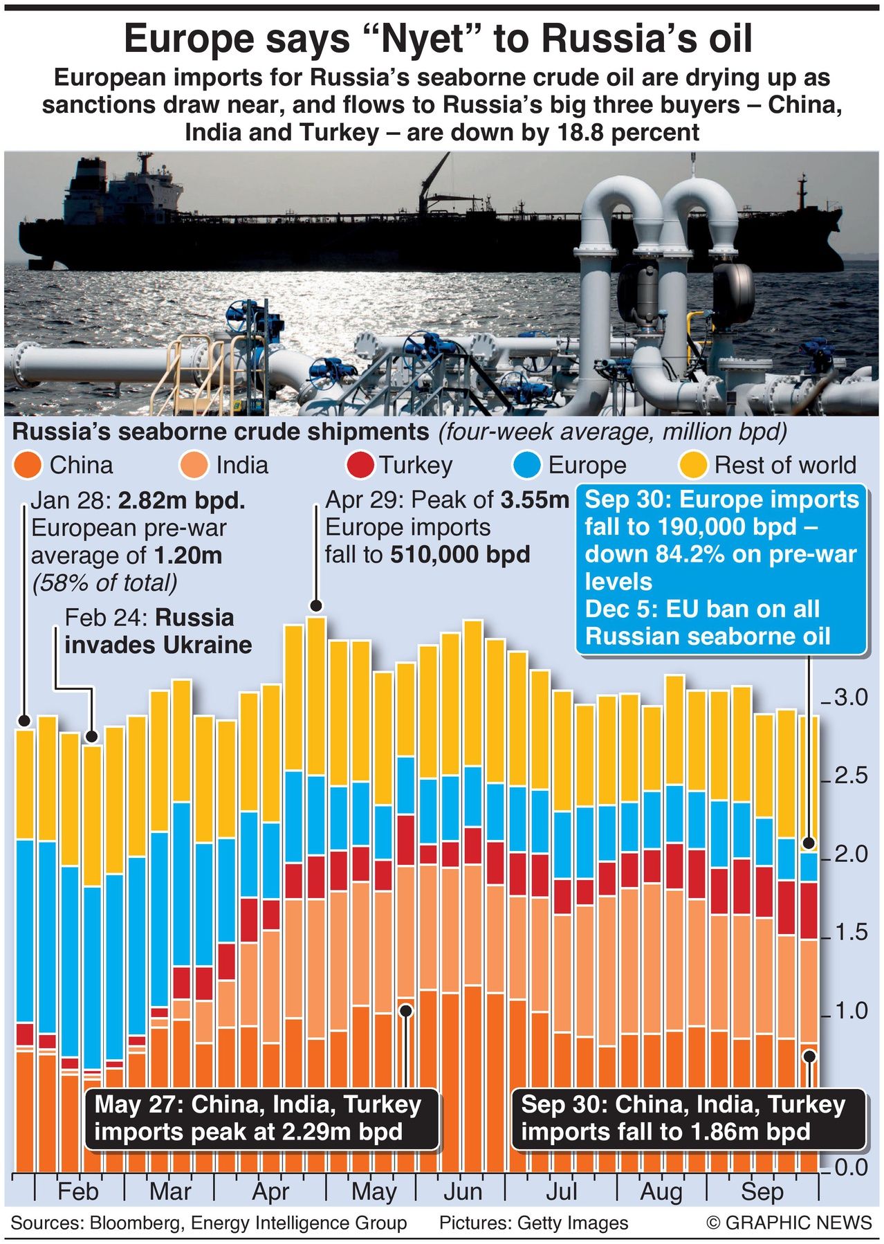 In the weeks before the invasion, Europe imported an average of 1.2 million barrels per day (bpd) of Russian oil -- about 58 percent of Russia’s total seaborne exports. As of September 30, the four-week average had fallen to just 190,000 bpd.
