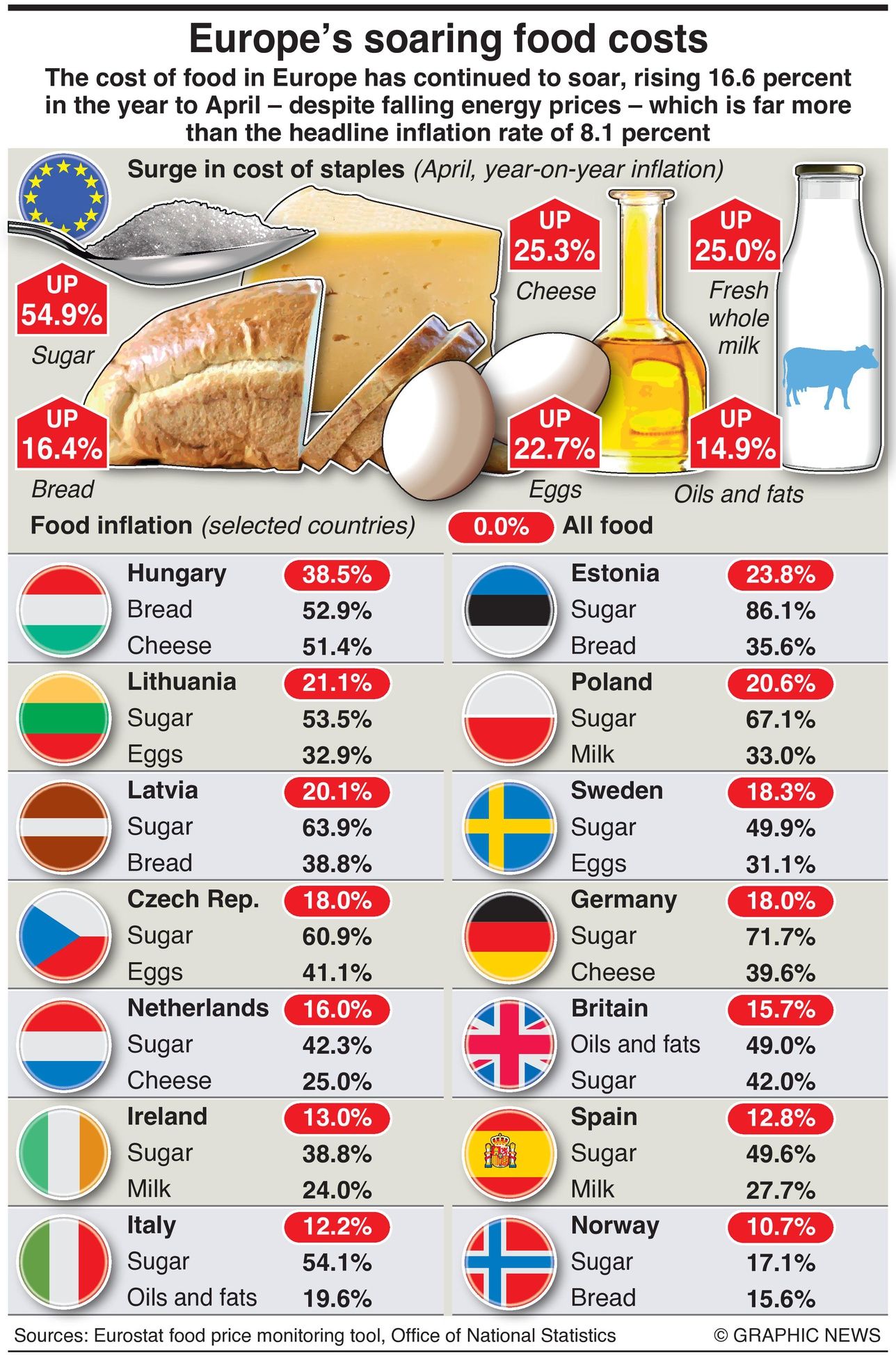 The cost of food in Europe has continued to soar, rising 16.6 percent in the year to April -- despite falling energy prices -- which is far more than the headline inflation rate of 8.1 percent.