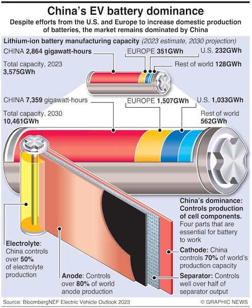 - China has a 60% market share of the EV battery market and is expanding production overseas to bypass regulations and restrictions