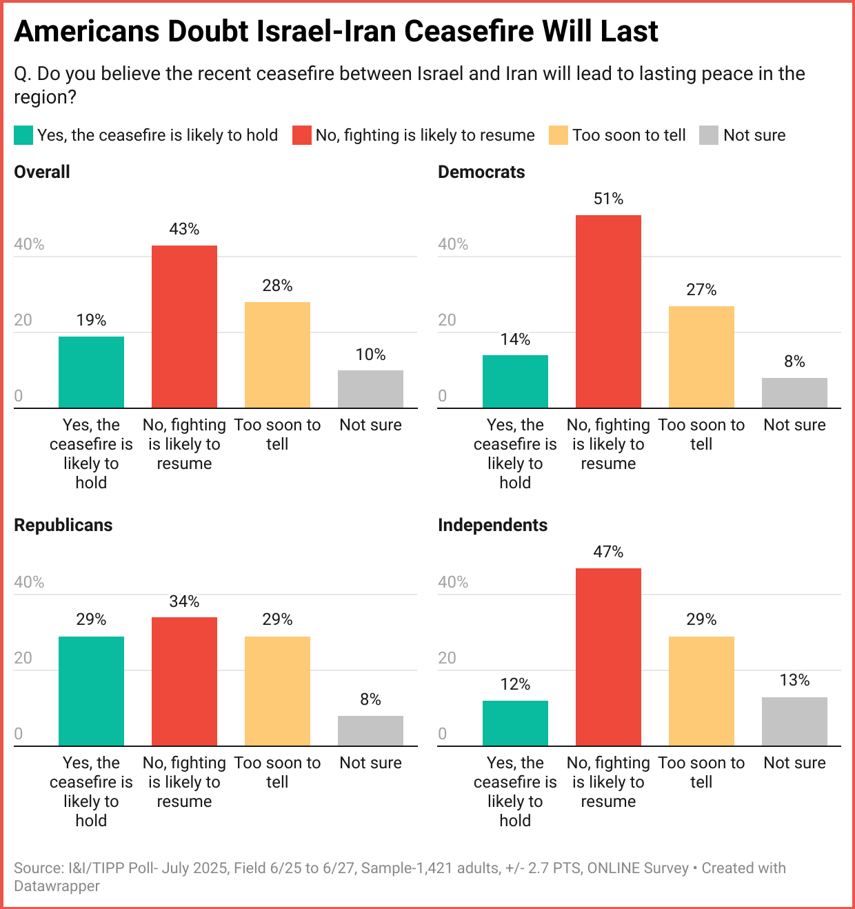 President Donald Trump's bold move to take out Iran's nuclear arms program and broker a ceasefire between Iran and Israel seems to have worked, at least so far. But while a large share of Americans believe the ceasefire won't hold, the majority are taking a wait-and-see approach, the latest I&I/TIPP Poll indicates.