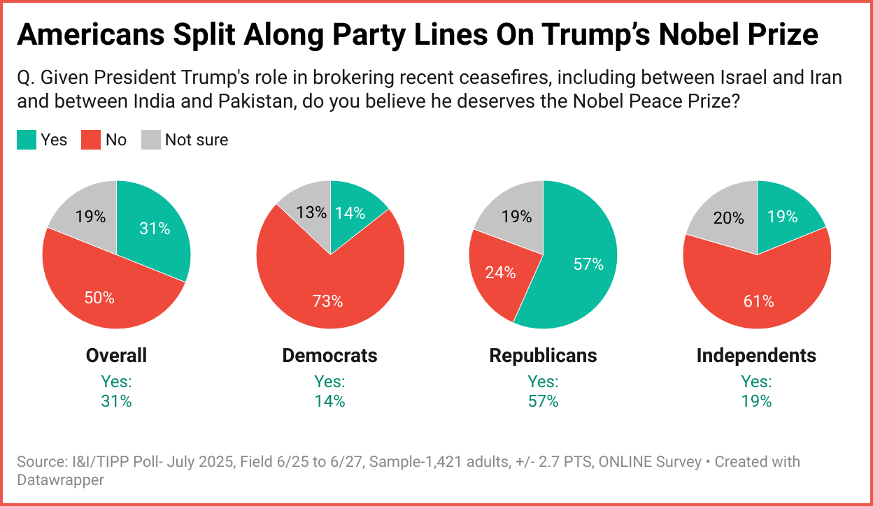 I&I/TIPP asked one other question: "Given President Trump's role in brokering recent ceasefires, including between Israel and Iran and between India and Pakistan, do you believe he deserves the Nobel Peace Prize?"