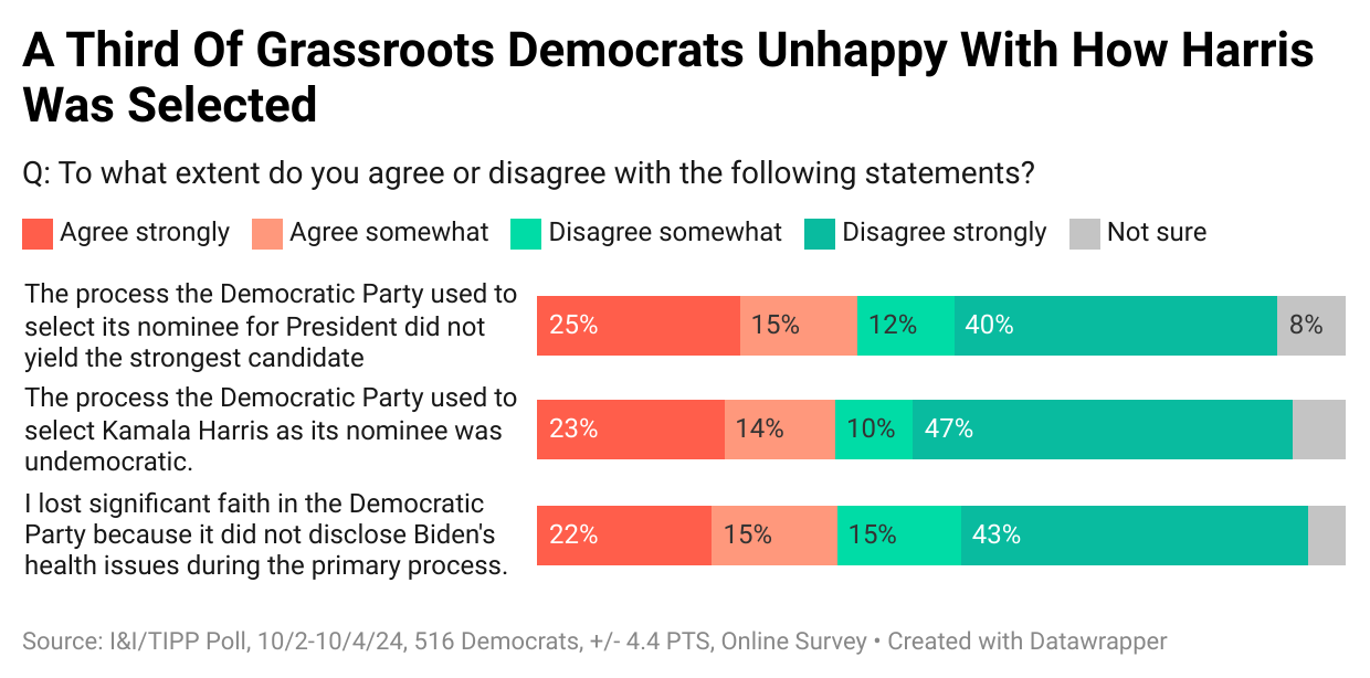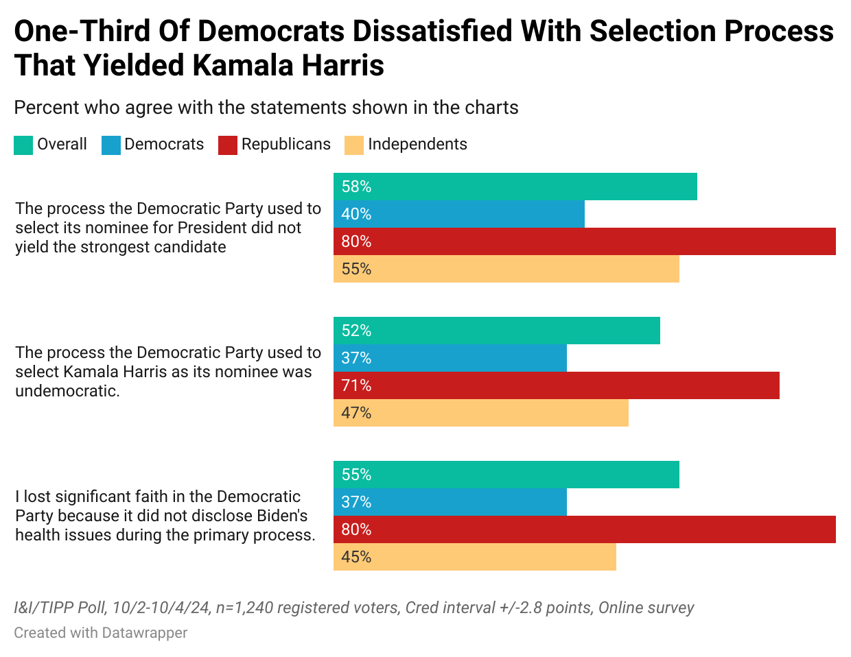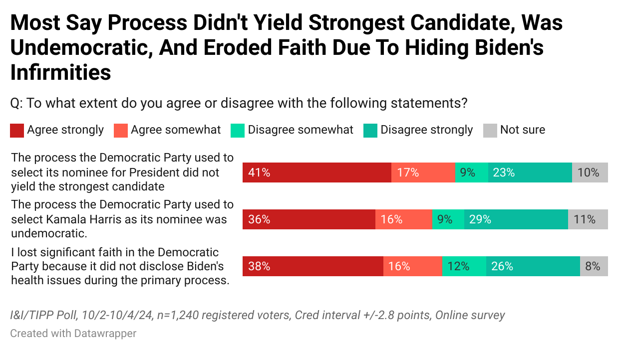 As Harris continues to struggle, the national online I&I/TIPP Poll of 1,240 registered voters indicates lingering widespread disappointment with the Democratic Party’s maneuvers to get rid of the age-impaired Biden last July.