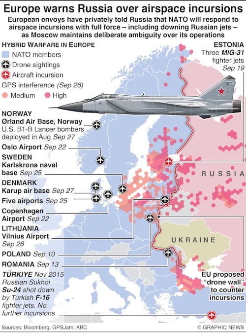 European envoys have privately told Russia that NATO will respond to airspace incursions with full force – including downing Russian jets – as Moscow maintains deliberate ambiguity over its operations.