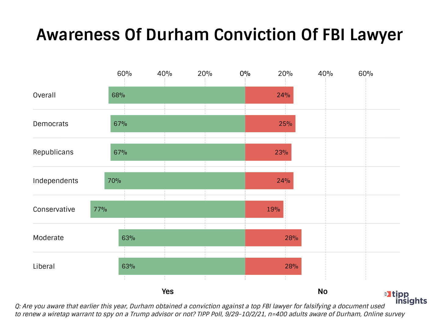 “The data show more grassroots support for Durham’s investigation than the media has reported,” Mayur said in an interview. “It appears to be a matter of great import to Americans, regardless of party affiliation,” at least for the 31 percent of Americans who are aware of what Durham has been doing.