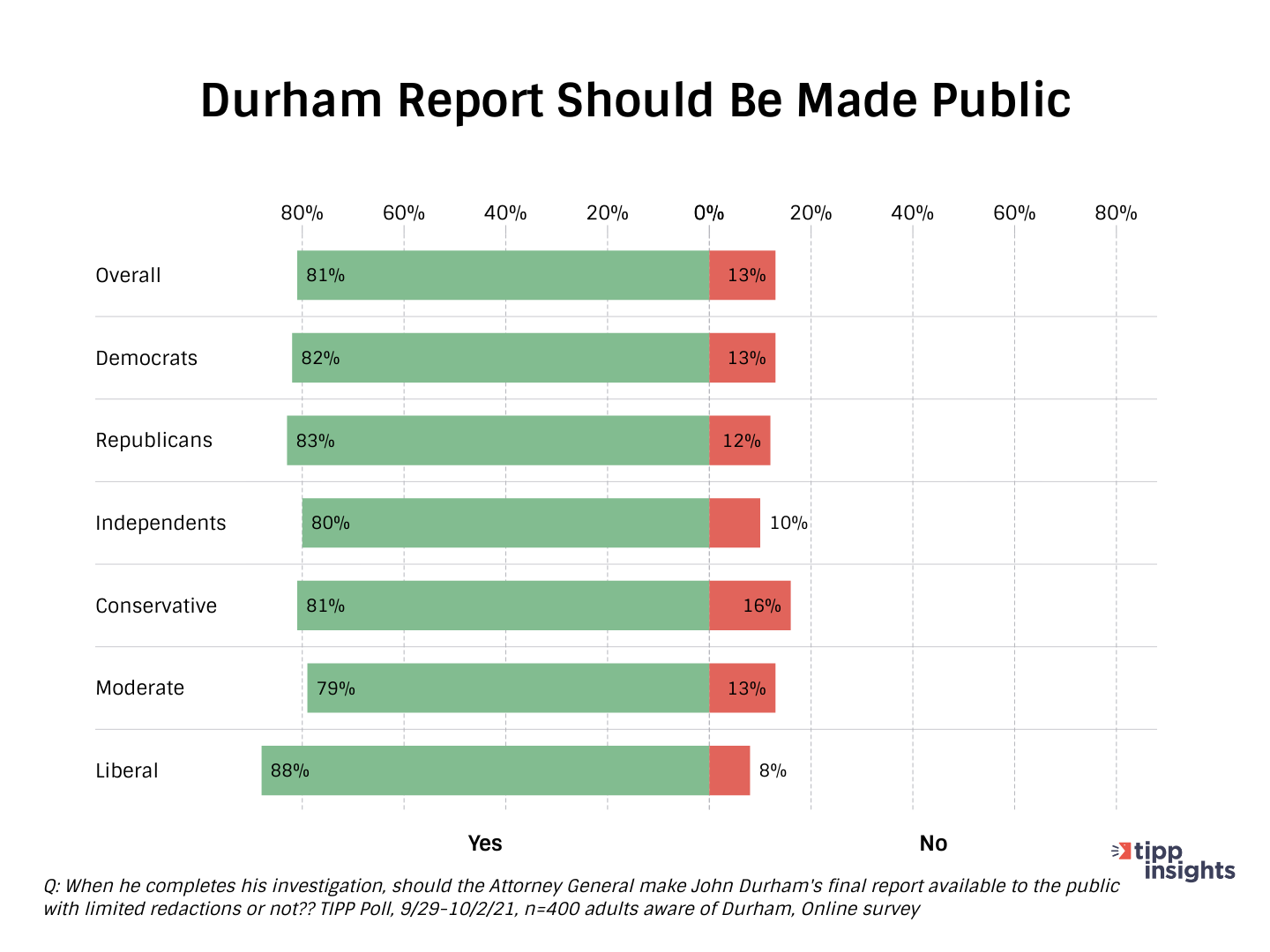 Nearly two-thirds (62 percent) of respondents say they want the Justice Department to renew Durham’s budget for another fiscal year, the TIPP poll found, and a whopping 81 percent want the department to release his final report to the public.