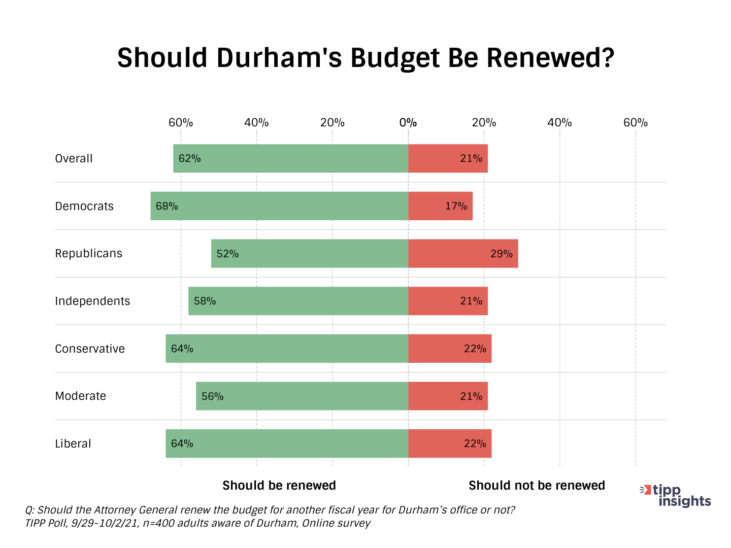 A surprisingly high share of Democrats—68 percent—agreed with Republicans and Independents that Durham’s budget should be renewed, while 82 percent of Democrats agreed his report should be released in full.
