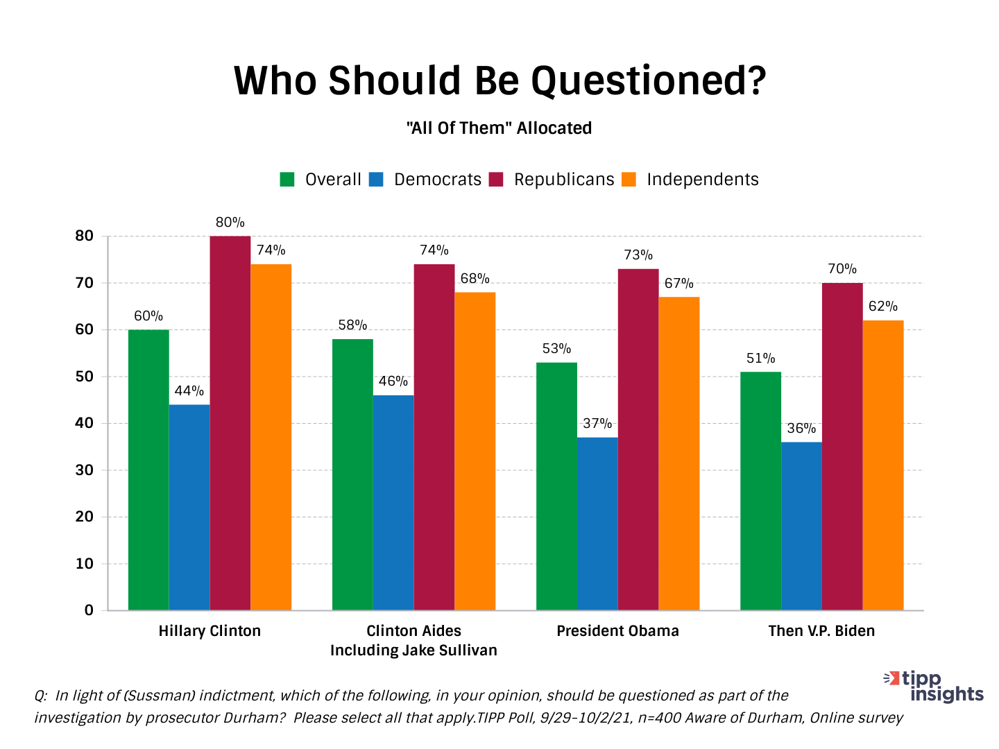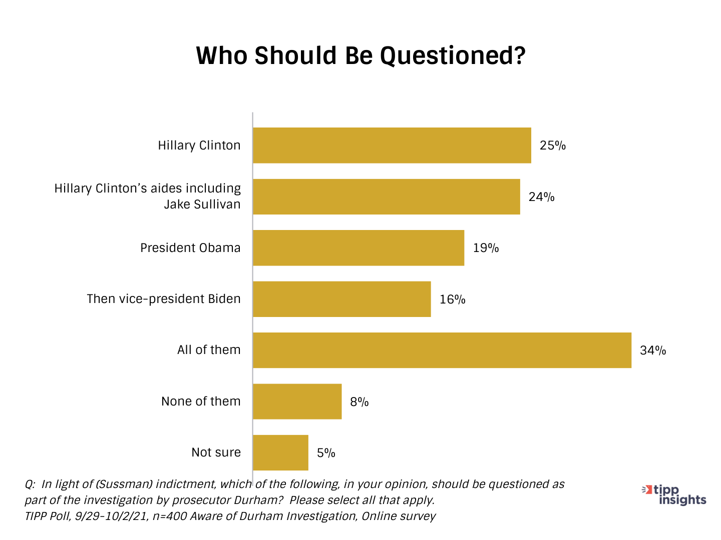TIPP asked the subset of survey respondents who said they were aware of Durham’s case if they think he should also question Hillary Clinton and her former top campaign officials—specifically, Jake Sullivan—as part of his investigation. Sixty percent answered yes to interviewing Clinton, while 58 percent said they wanted to see Sullivan and other Clinton aides questioned before the federal grand jury Durham’s impaneled in D.C.