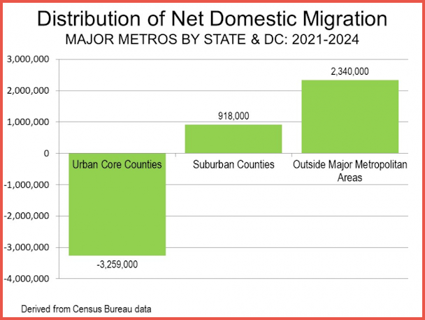 Between 2010 and 2020, the suburbs and exurbs of the major metropolitan areas gained 2 million net domestic migrants, while the urban core counties lost 2.7 million. The pandemic, which normalized remote work and encouraged people to keep their distance, turbocharged this movement to smaller, less crowded, less expensive housing markets. Through the first four years of this decade, the urban core counties of the major metropolitan areas (over 1,000,000 population) lost 3,259,000 net domestic migrants, three times the rate of loss in the last decade. In contrast, 2.3 million net domestic migrants moved outside the major metros.