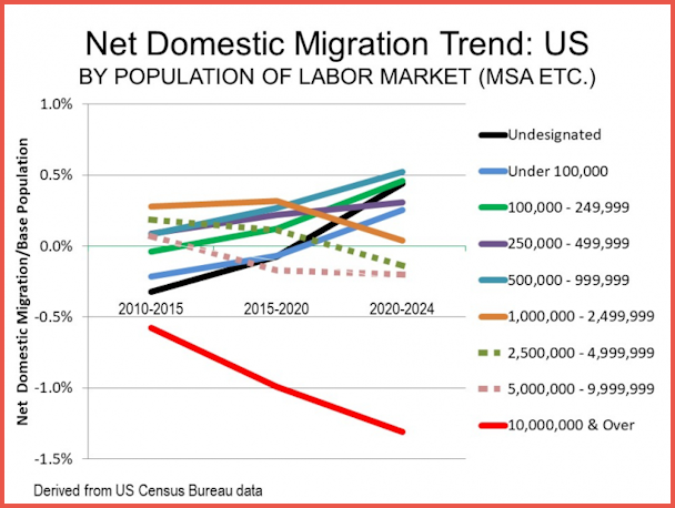 The new data through 2024 reflects a profound reversal of this earlier trend, a shift from patterns that have existed for at least a century. Each of the population categories of 1,000,000 or more lost net domestic migration after 2015, while all of the smaller population categories gained net domestic migration.