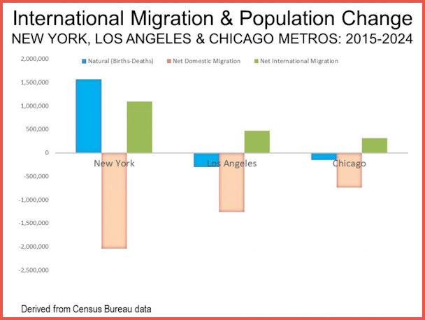 As domestic migrants increasingly left the big metros early last decade, immigrants from abroad made up for the loss. In the New York, Los Angeles, and Chicago metros, the net international migration continued, but was outpaced by outmigration of current residents since 2020 But now, for the first time since the pioneer age, medium sized metros like Columbus, Indianapolis, and Des Moines, are now attracting a higher percentage of foreign migrants than traditional centers like Los Angeles, the San Francisco Bay Area, or New York.