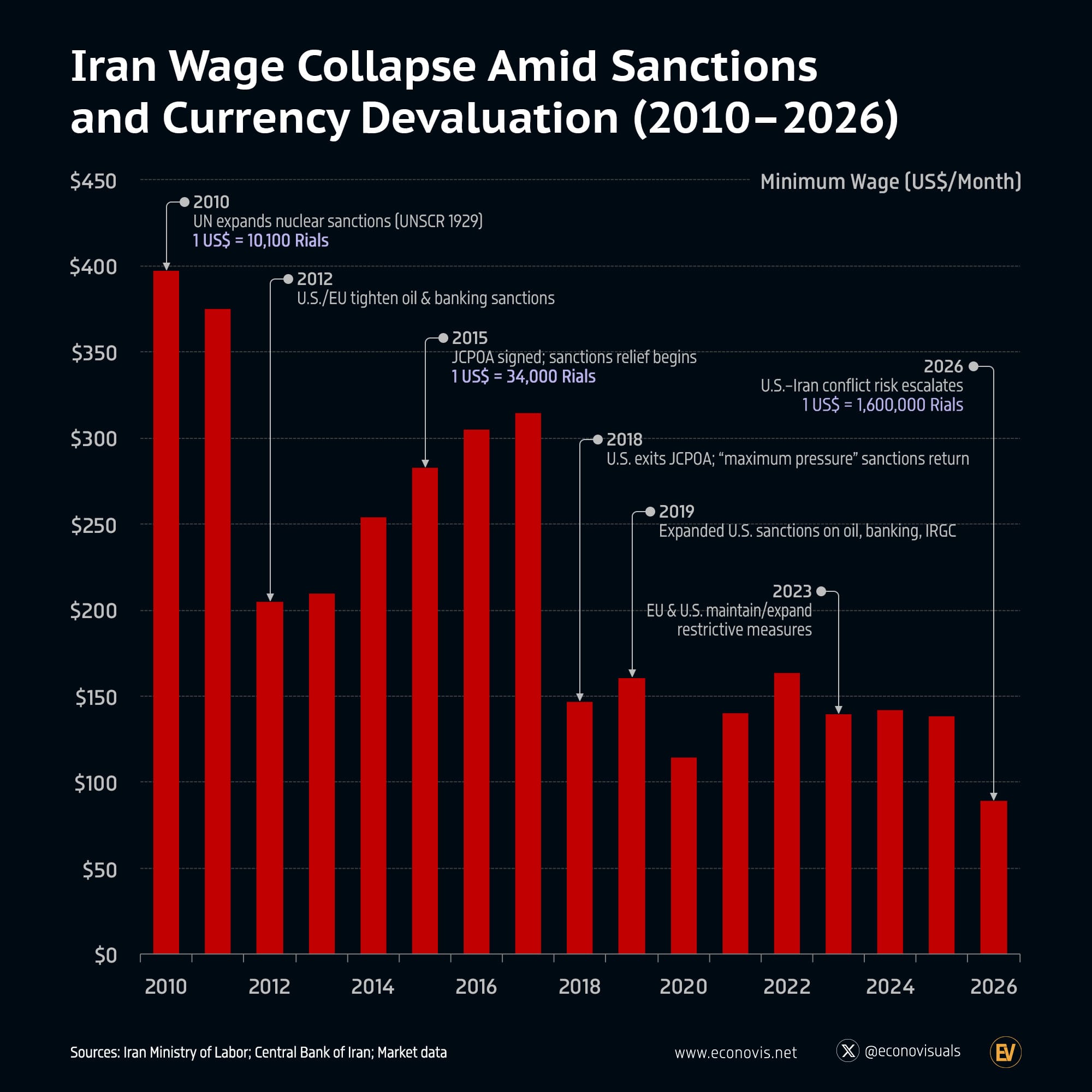 Iran’s minimum wage, measured in U.S. dollars, has fallen dramatically over the past decade as sanctions and currency devaluation reduced purchasing power. Despite nominal wage increases in local currency, repeated devaluations have sharply lowered real earnings in global terms.