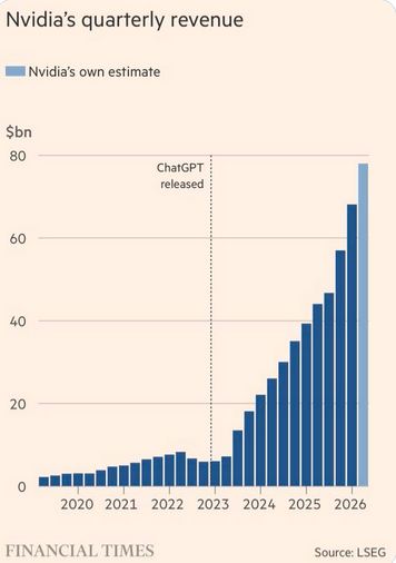 Nvidia’s quarterly revenue has accelerated sharply since late 2022, coinciding with the rise of generative AI tools. The company’s sales have multiplied in just a few years, reflecting booming demand for AI chips used in data centers and advanced computing.