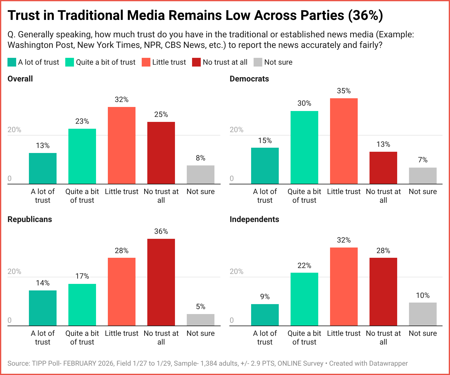The consequences are no longer anecdotal. Trust in traditional media now stands at just 36%. A combined 57% of Americans say they have little or no trust at all. Among Republicans, 64% express distrust. Among independents, distrust reaches 60%. Even among Democrats, more express little trust than great trust. The credibility gap is no longer partisan rhetoric; it is a measurable reality.