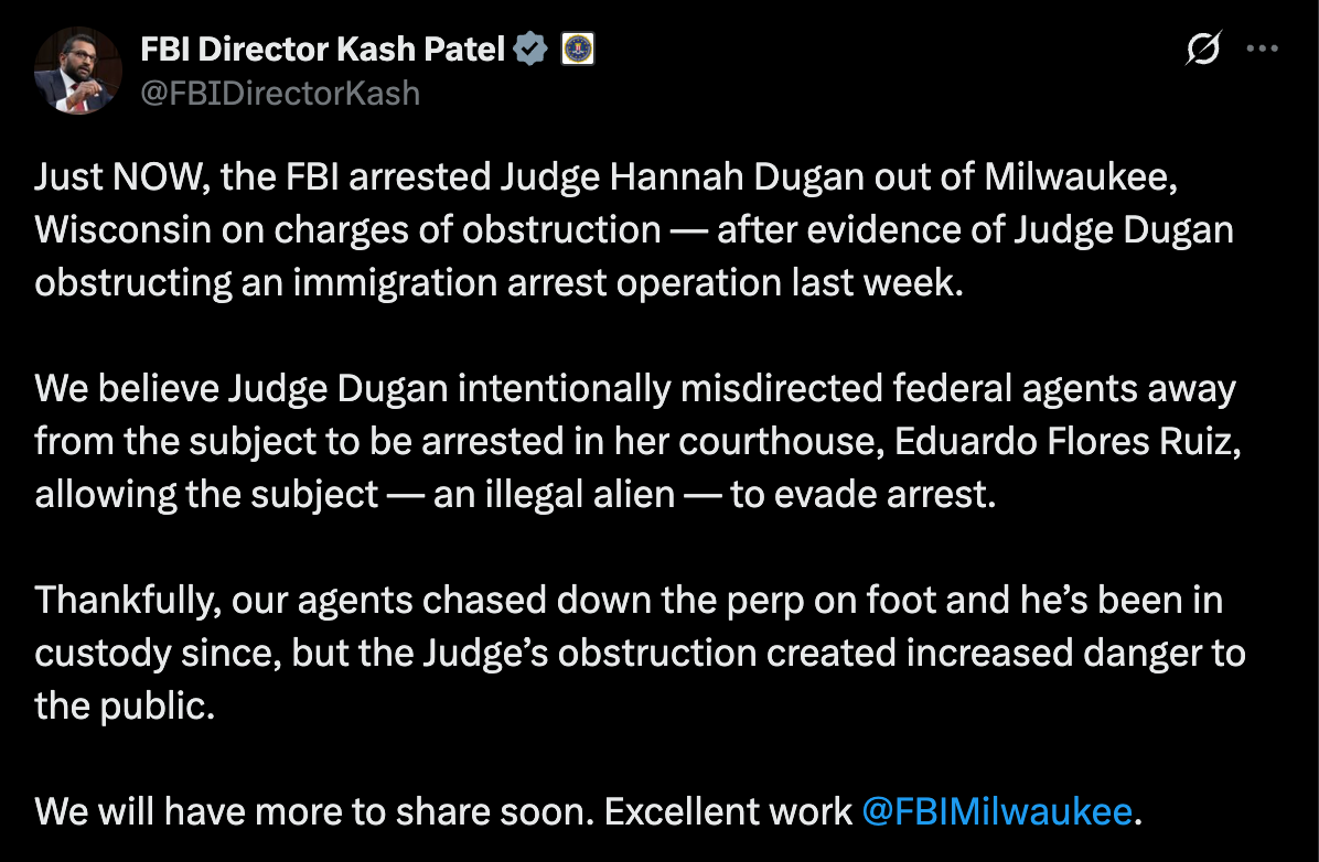 In a post on X, FBI Director Kash Patel alleged that Judge Dugan “intentionally misdirected” agents, allowing Flores Ruiz to flee. Flores Ruiz, who was in court for a domestic abuse case, was later chased down and arrested nearby.