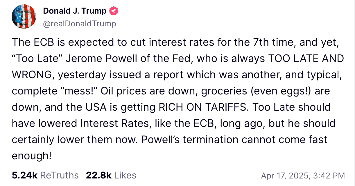 Donald Trump lashed out at Federal Reserve Chair Jerome Powell on Thursday, accusing him of being slow to act on interest rates. In a fiery Truth Social post, Trump called Powell “always too late and wrong,” adding, “Powell’s termination cannot come fast enough.”