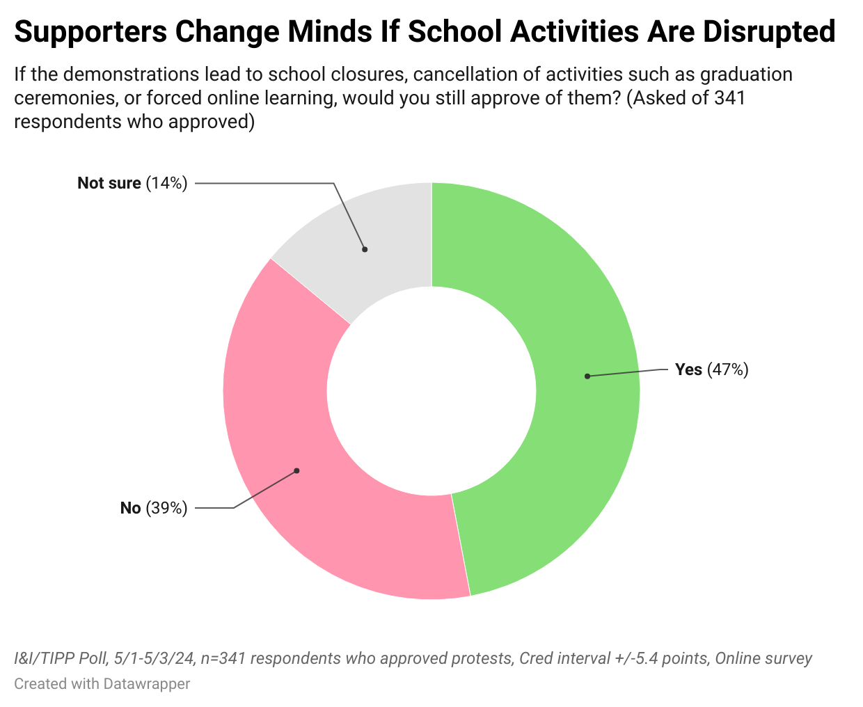 I&I/TIPP asked a follow-on question of those who expressed support for the demonstrations: “If the demonstrations lead to school closures, cancellation of activities such as graduation ceremonies, or forced online learning, would you still approve of them?”