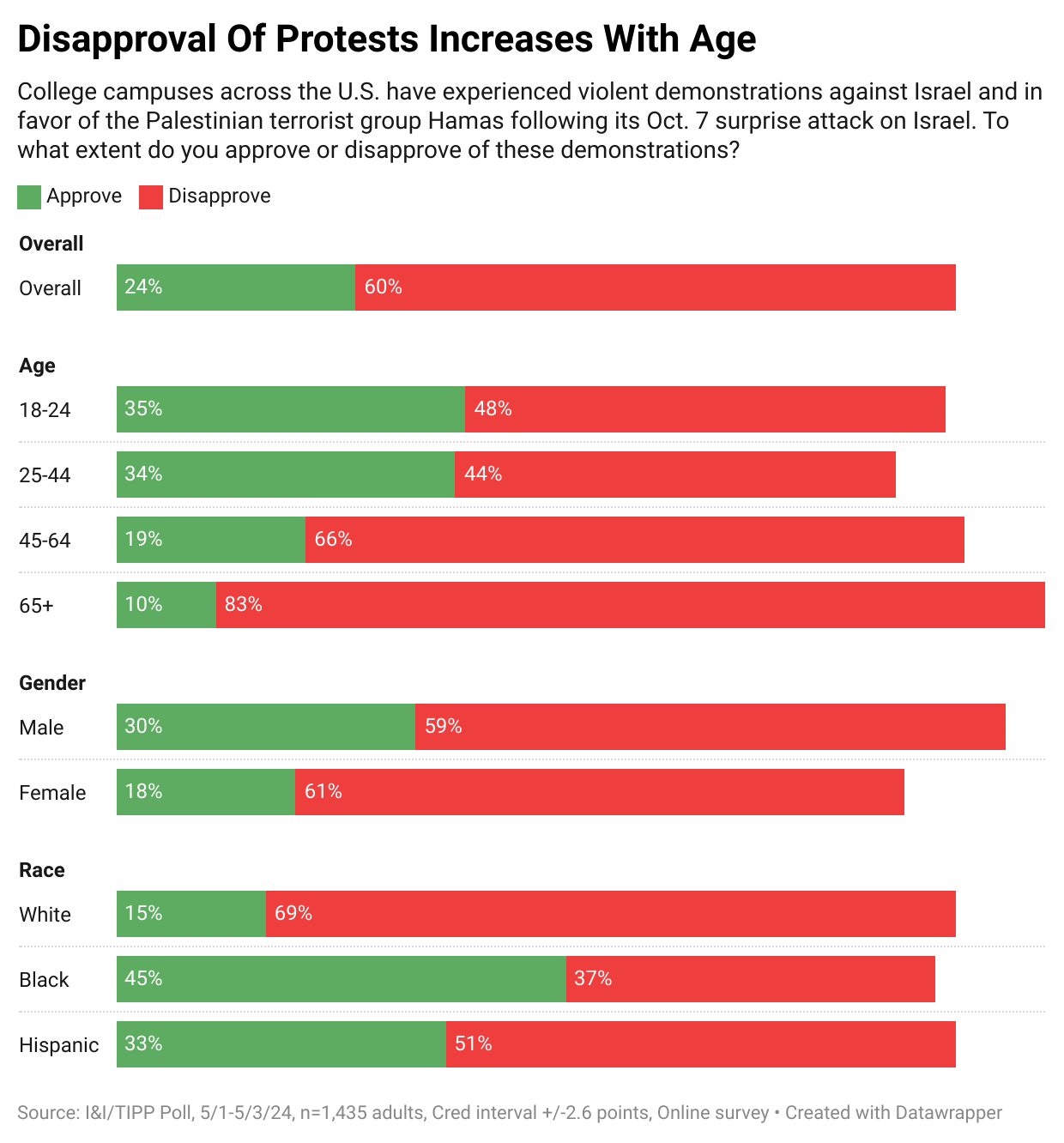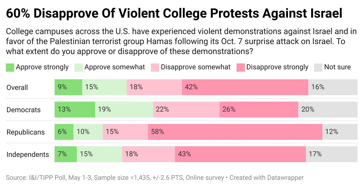 A solid majority of Americans are not happy with this, according to May’s national online I&I/TIPP Poll of 1,435 adults, taken May 1-3. Some 60% of all those said they either disapprove “somewhat” (18%) or “strongly” (42%) with the demonstrations.