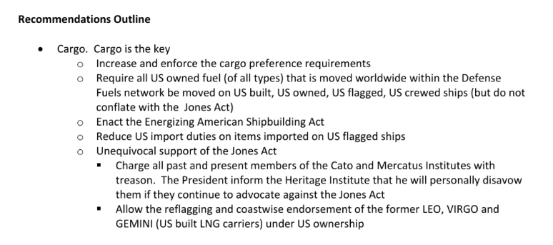 The same recommendation also suggests that then-President Donald Trump disavow the “Heritage Institute” if the think tank continues anti-Jones Act advocacy. Members of the conservative-leaning Heritage Foundation have consistently argued that the Jones Act is counterproductive to U.S. interests.