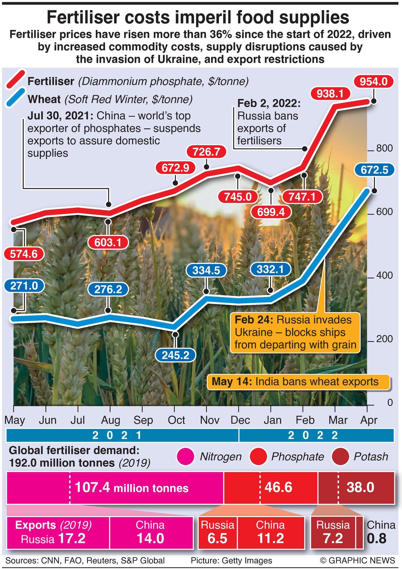 Russian fertilizers are not subject to Western sanctions, but the world’s largest exporter has blocked vital exports. According to the Food and Agriculture Organization, Russia accounted for 16% of global exports of nitrogenous fertilizers, 19% of potash, and 14% of phosphates in 2019.