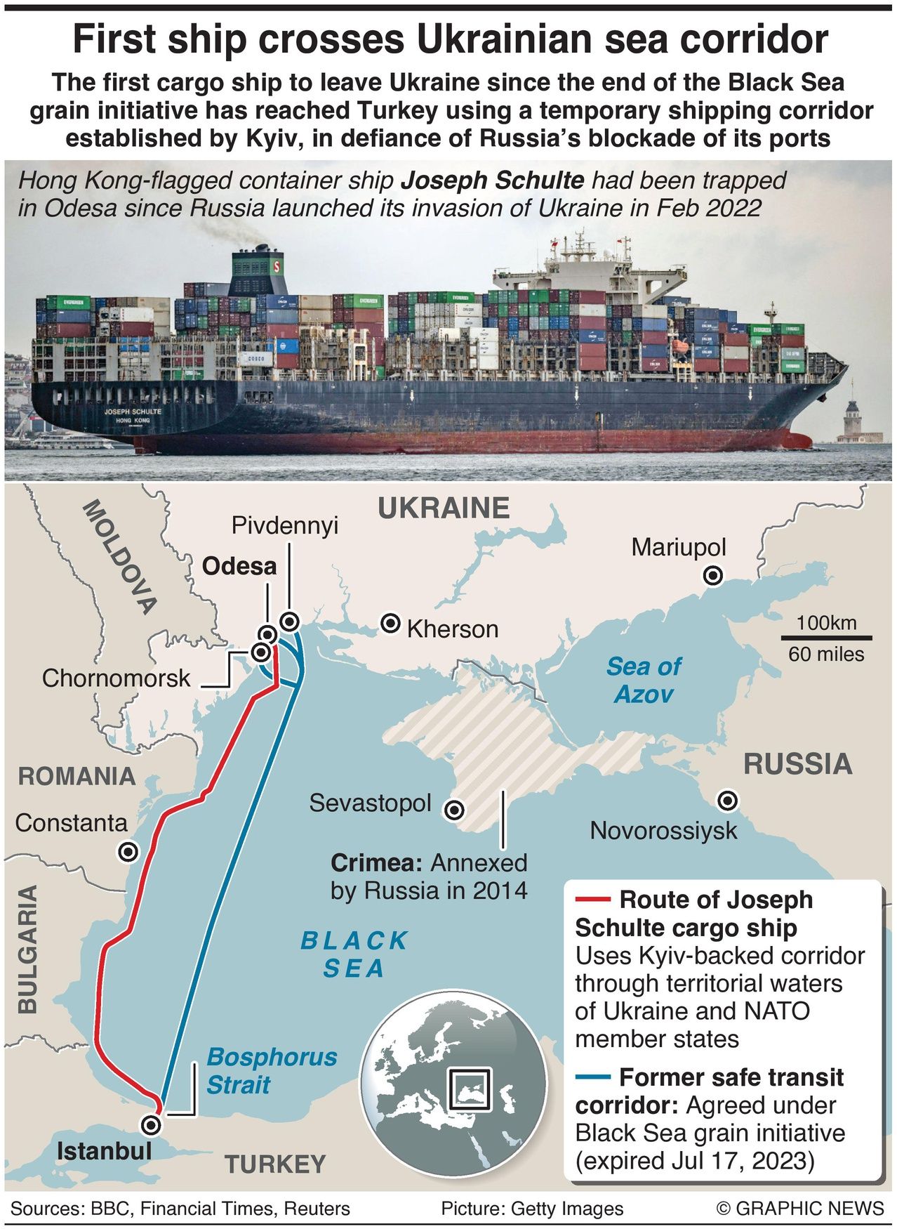 The first civilian ship to sail from Ukraine since the end of the Black Sea grain deal has reached Turkey using a temporary shipping corridor established by Kyiv.