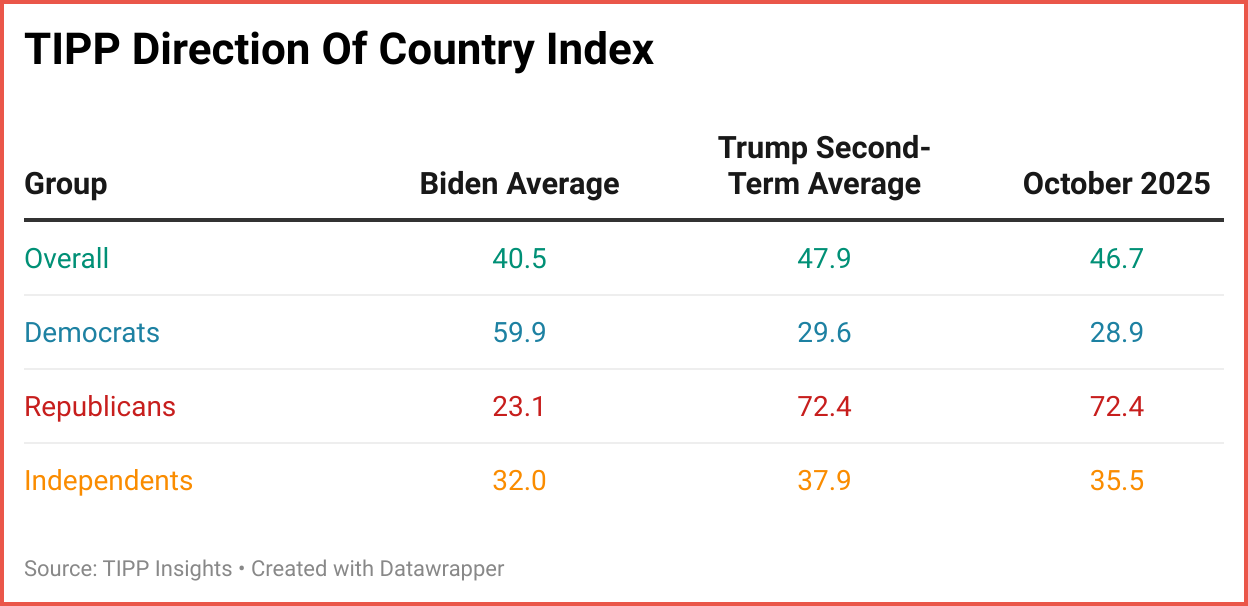 Overall optimism now stands at 46.7. The average during the first nine months of President Trump’s second term is 47.9, notably higher than the Biden-era average of 40.5.