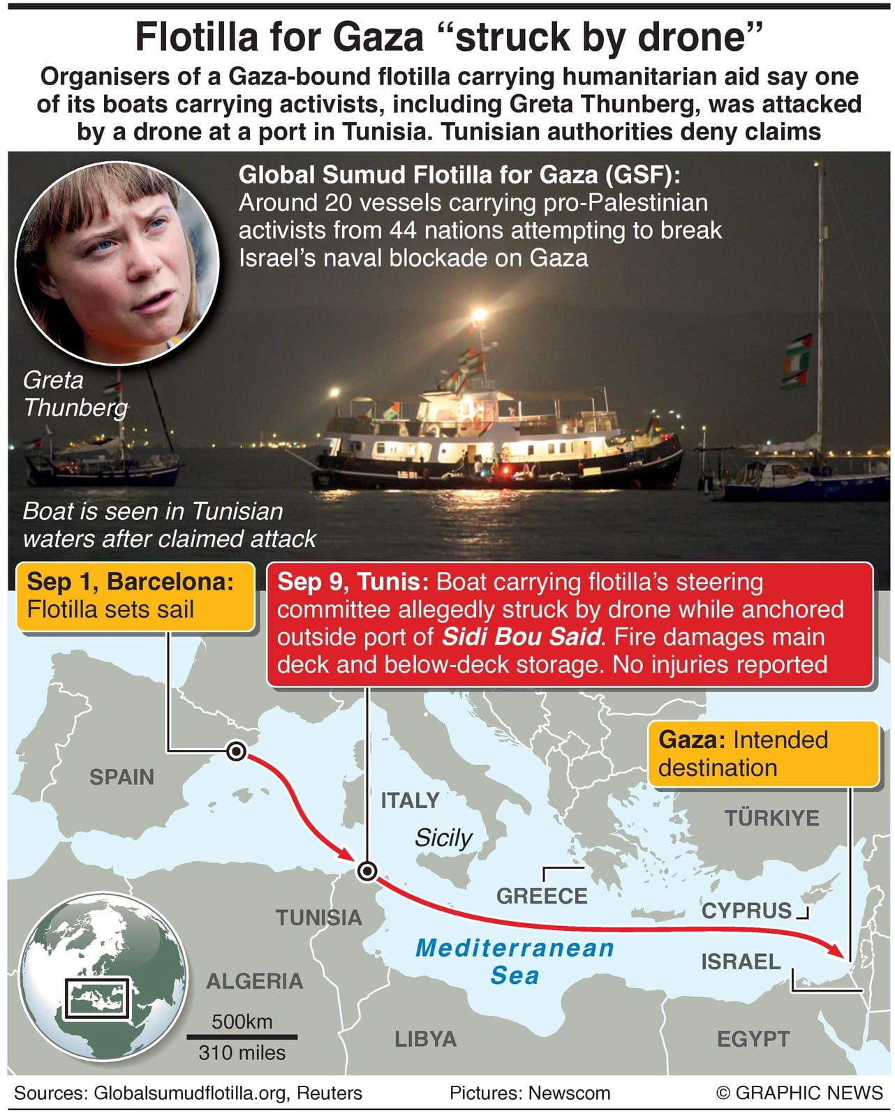 Organizers of a Gaza-bound flotilla carrying humanitarian aid say one of its boats carrying activists, including Greta Thunberg, was attacked by a drone at a port in Tunisia. Tunisian authorities deny claims.