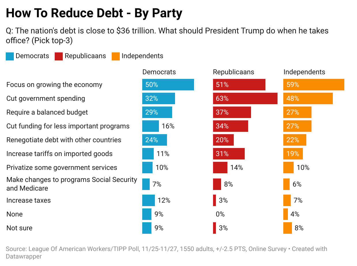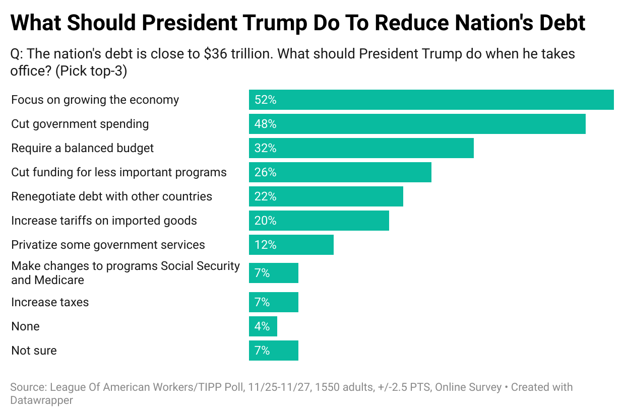 The U.S. national debt has become a hot topic and matter of concern among Americans. TIPP Poll conducted a nationwide survey for the League of American Workers soon after Trump won the elections and asked over 1550 citizens what the new President should do to reduce the nation's debt.