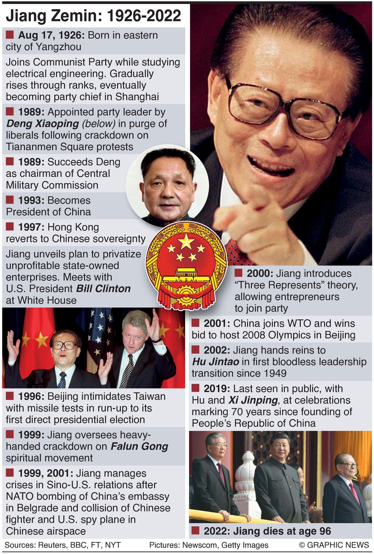 Former Chinese leader Jiang Zemin, who led his country out of isolation after the crushing of pro-democracy protests in Tiananmen Square and supported economic reforms that led to a decade of explosive growth, has died at 96.