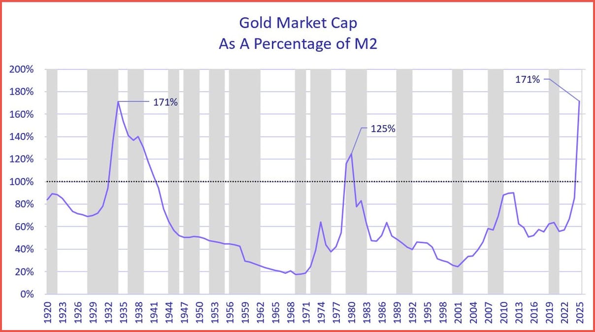 This chart compares gold’s total market value to M2, a broad measure of money in the economy that includes cash, checking accounts, savings accounts, and money-market funds. When gold’s market cap rises sharply relative to M2, it suggests gold is absorbing an unusually large share of available liquidity. As Cathie Wood notes, the ratio has now reached an all-time high—above the peak seen in 1980 when inflation and interest rates surged—raising the odds that gold prices are nearing a turning point.
