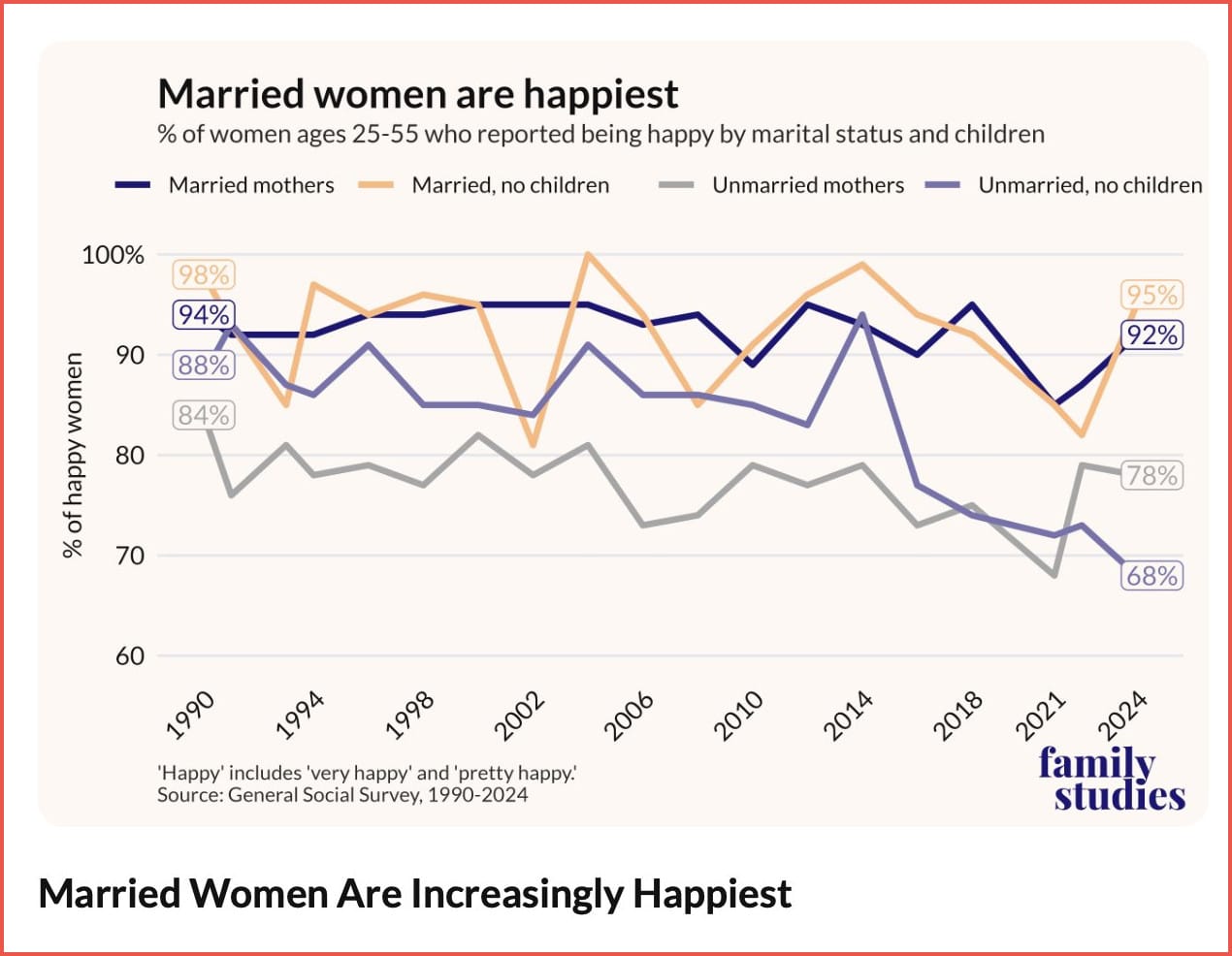 Among women ages 25–55, those who are married consistently report higher happiness than unmarried peers, with the gap widening in recent years. The trend holds whether or not children are present, suggesting marital status—not parenthood alone—is strongly associated with reported well-being.