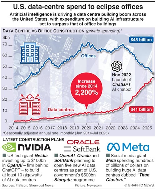 Artificial intelligence is driving a data center building boom across the U.S., with spending on building AI infrastructure set to surpass that of office buildings.