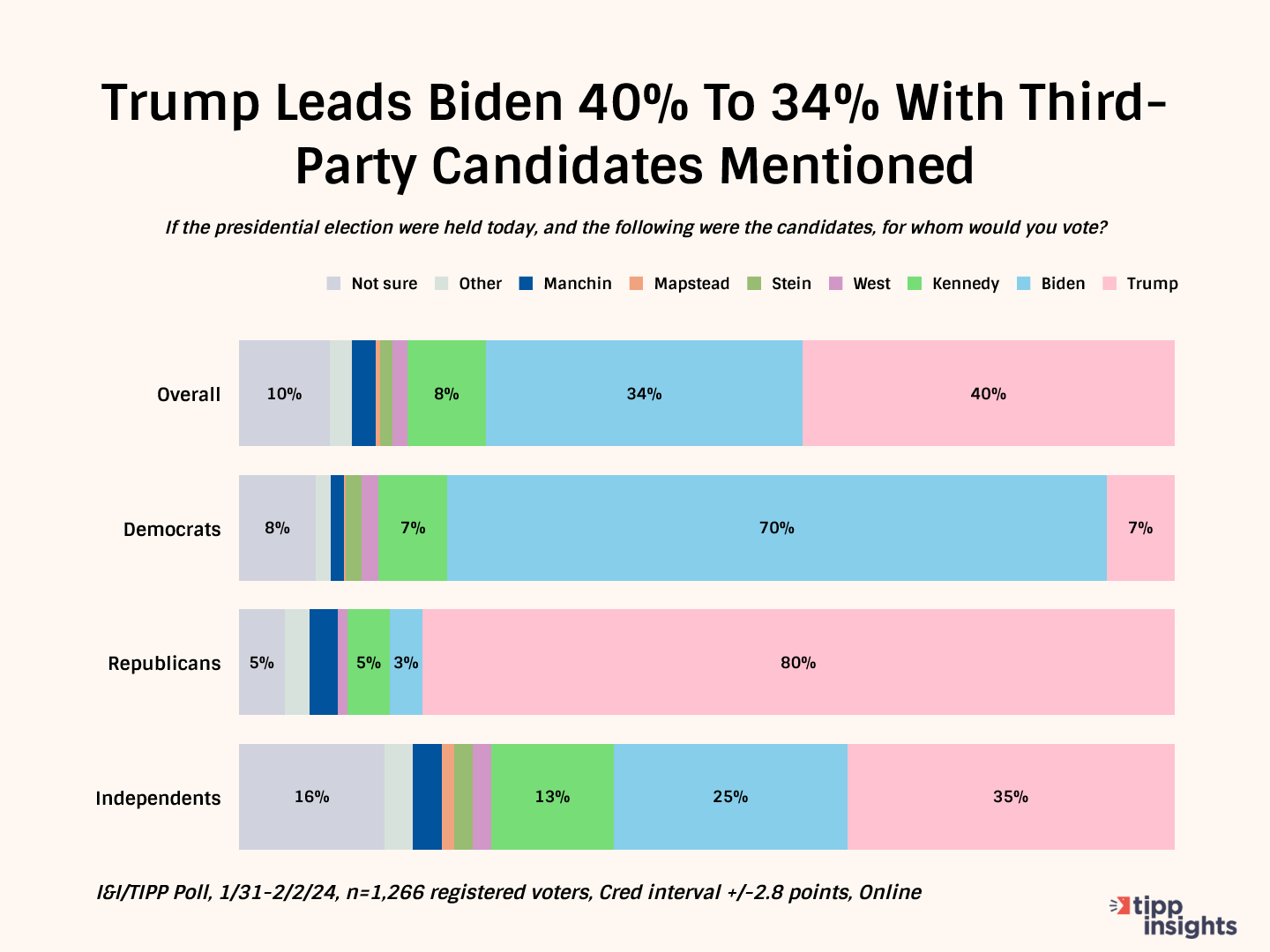 As ordered immediately above, Trump gets 40%, Biden 34%, Kennedy 8%, West 2%, Stein and Mapstead 1% each, Manchin 3% and “other” (2%) and “not sure” 10%.