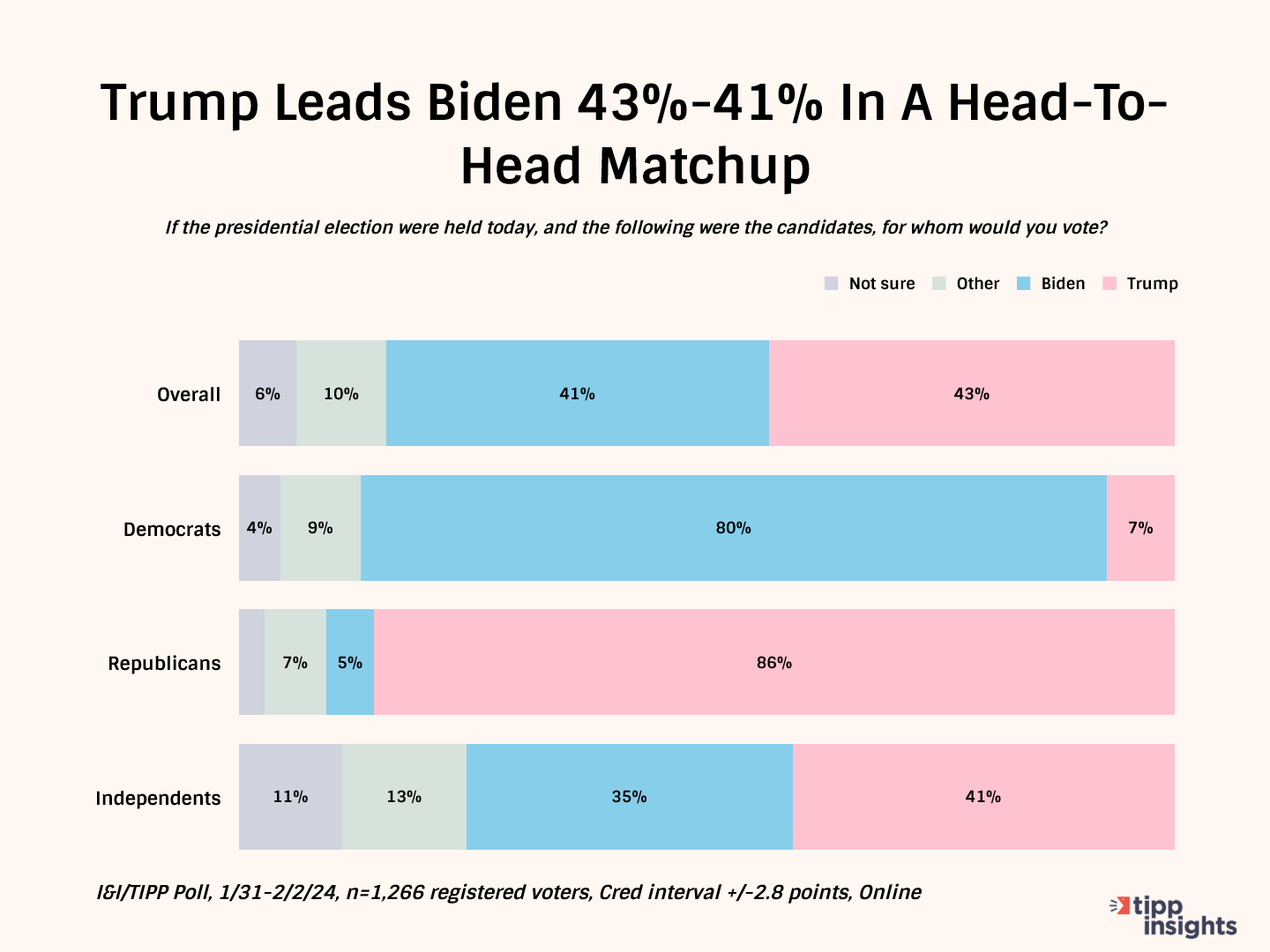 Trump wins 43% of the overall vote, while Biden gets 41% in the national online I&I/TIPP Poll, taken from Jan. 31-Feb. 2, with 1,266 registered voters participating. The poll has an overall +/-2.8 percentage-point margin of error.