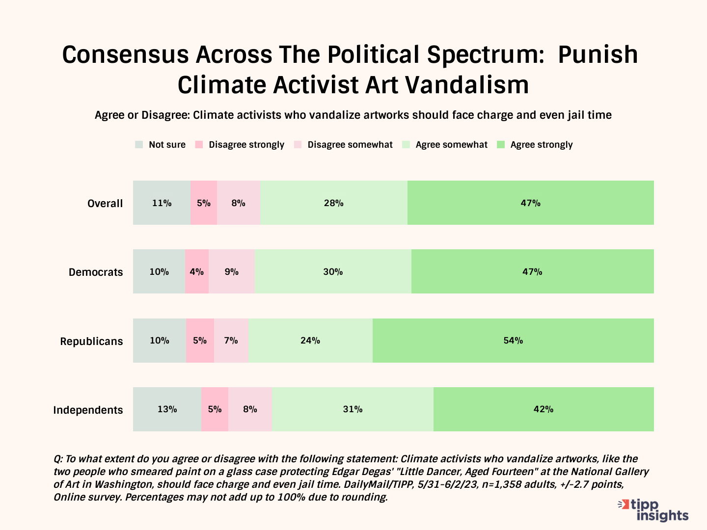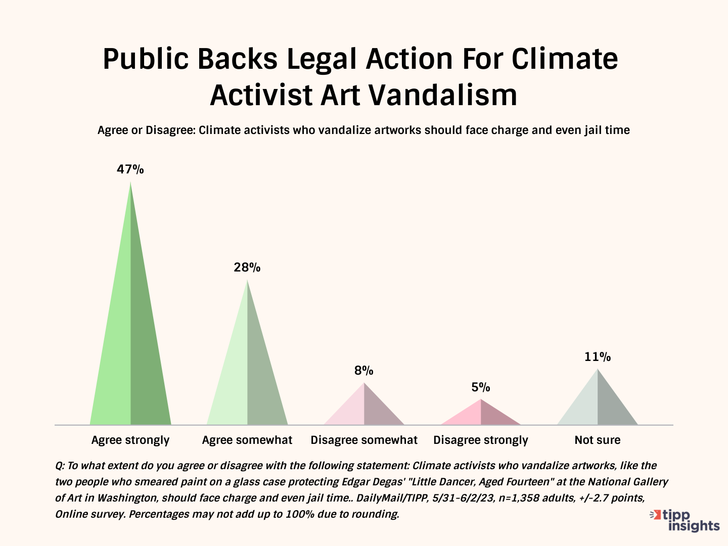 Fully three quarters of US voters say climate change activists should face criminal charges and even jail time for vandalizing beloved artworks, an exclusive DailyMail.com/TIPP poll shows.