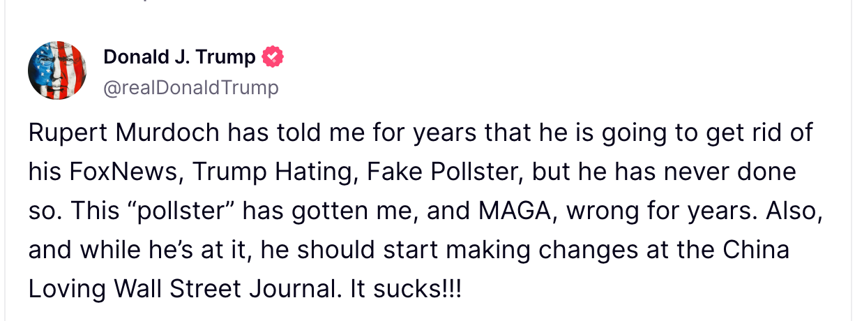Meanwhile, Trump fired off on Truth Social, venting frustrations at longtime media allies. “Rupert Murdoch has told me for years that he is going to get rid of his Fox News, Trump-hating, Fake Pollster, but he has never done so,” Trump wrote. He also slammed The Wall Street Journal as “China Loving,” adding, “It sucks!!!”