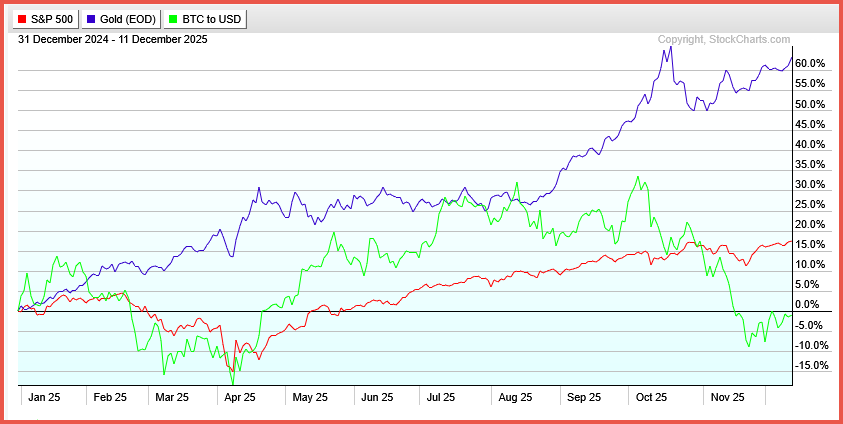 Gold is up roughly 63.2% year-to-date, far outpacing the S&P 500’s 17.3% gain, while Bitcoin has swung from mid-year highs to roughly 1% loss.