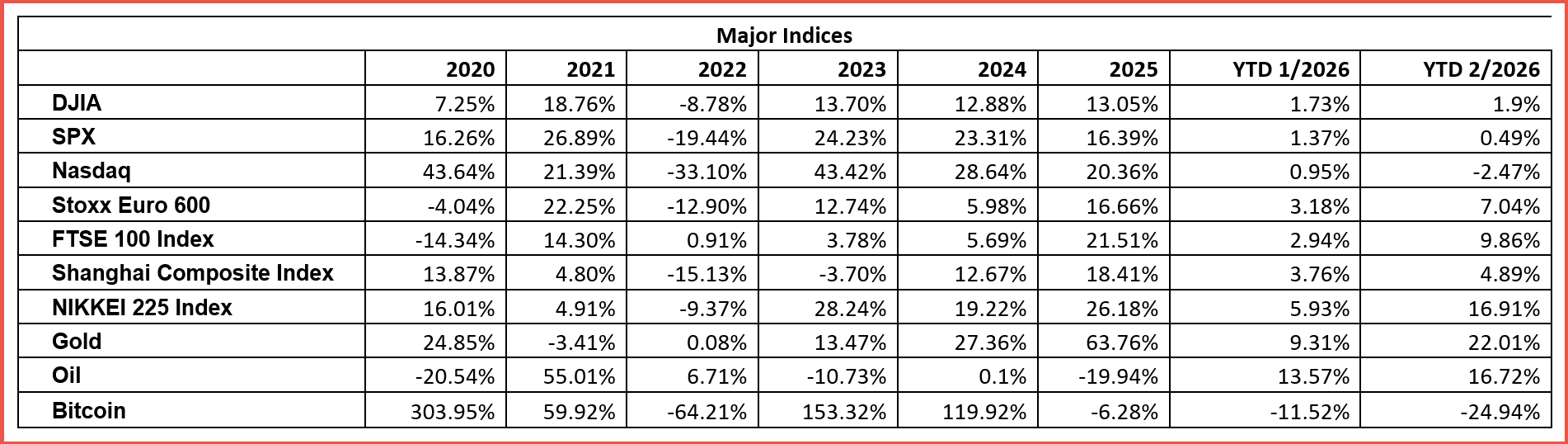 February markets illustrated widening dispersion across asset classes. While the S&P 500 and Nasdaq slipped, gains in Europe, Japan, and China helped offset losses globally. Gold surged while Bitcoin moved sharply in the opposite direction, underscoring increasingly fragmented market trends.