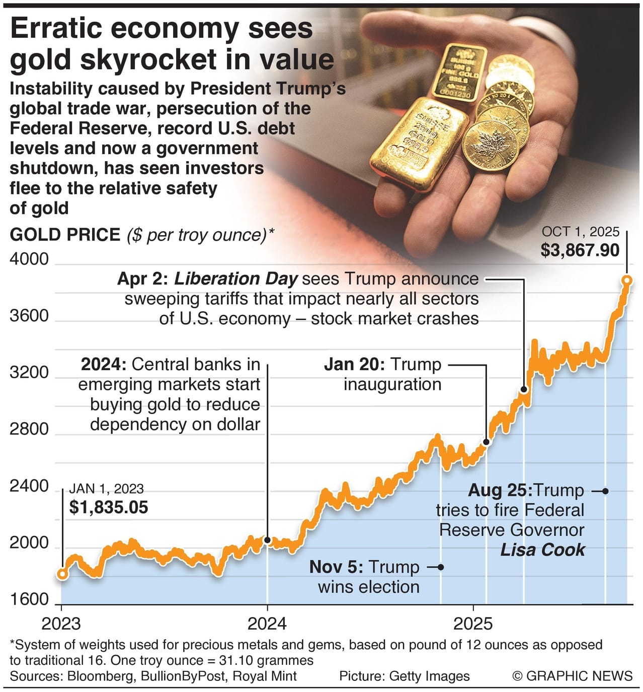 Bullion ended October 1 at $3,867.90 per troy ounce after U.S. lawmakers failed to reach a deal on federal funding, triggering the first government shutdown in almost seven years.