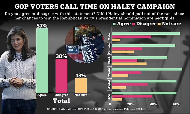 Fully 57 percent of registered Republican primary voters say Haley should exit the race, our DailyMail.com/TIPP poll shows. Less than a third say she should keep running; another 13 percent said they were not sure.
