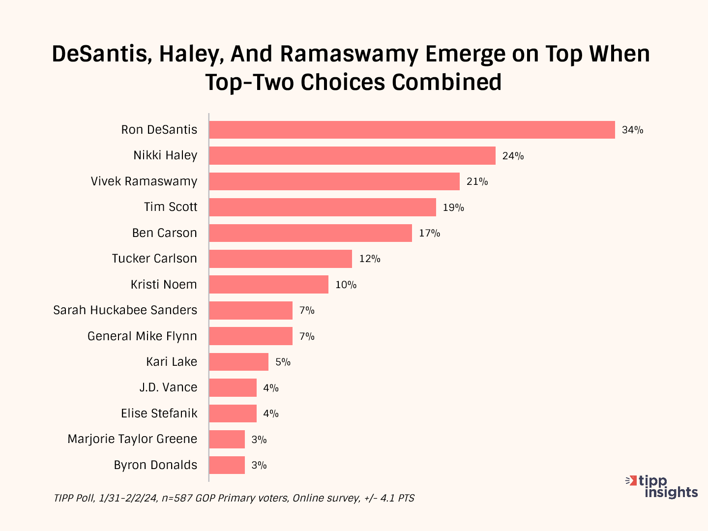 It wasn’t very close. DeSantis received 34% of the total votes cast on both questions, compared to 24% for Haley, 21% for Ramaswamy, 19% for Scott, 17% for Carson, 12% for TV personality and commentator Tucker Carlson and 10% for South Dakota Gov. Kristi Noem.