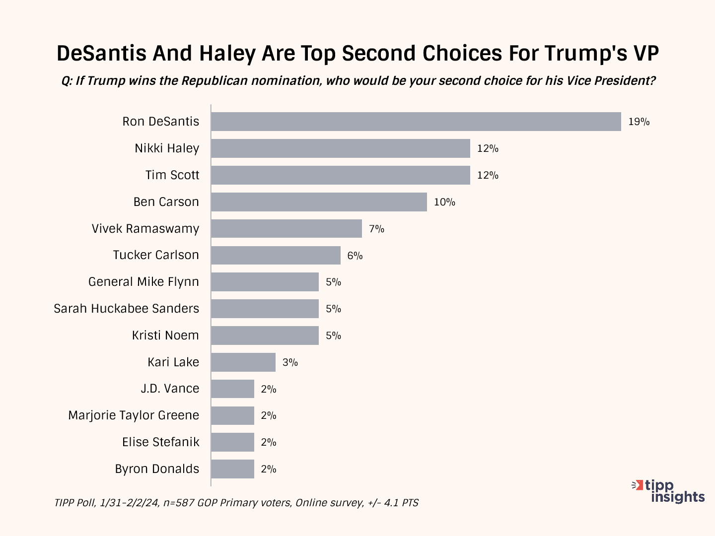 A presidential candidate’s running mate is usually chosen to “balance” the ticket to shore up electoral weaknesses. But in former President Donald Trump’s case, his vice presidential pick is likely to receive added scrutiny due to his multitude of legal problems. That’s why this month I&I/TIPP asked U.S. voters: Who should Trump’s vice presidential running mate be?