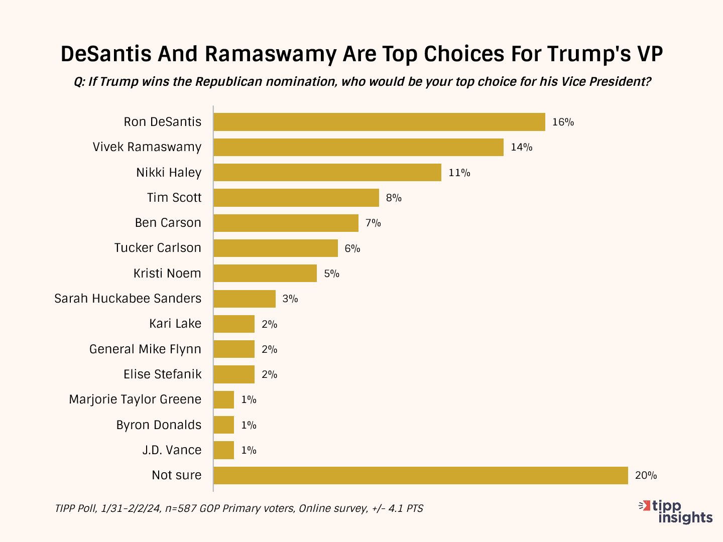 Out of 14 possible names for the question about the “top choice” for vice president, only three reach double-digits: Florida Gov. Ron DeSantis (16%), entrepreneur, author and former presidential candidate Vivek Ramaswamy (14%), and former United Nations Ambassador and South Carolina Gov. Nikki Haley (11%).