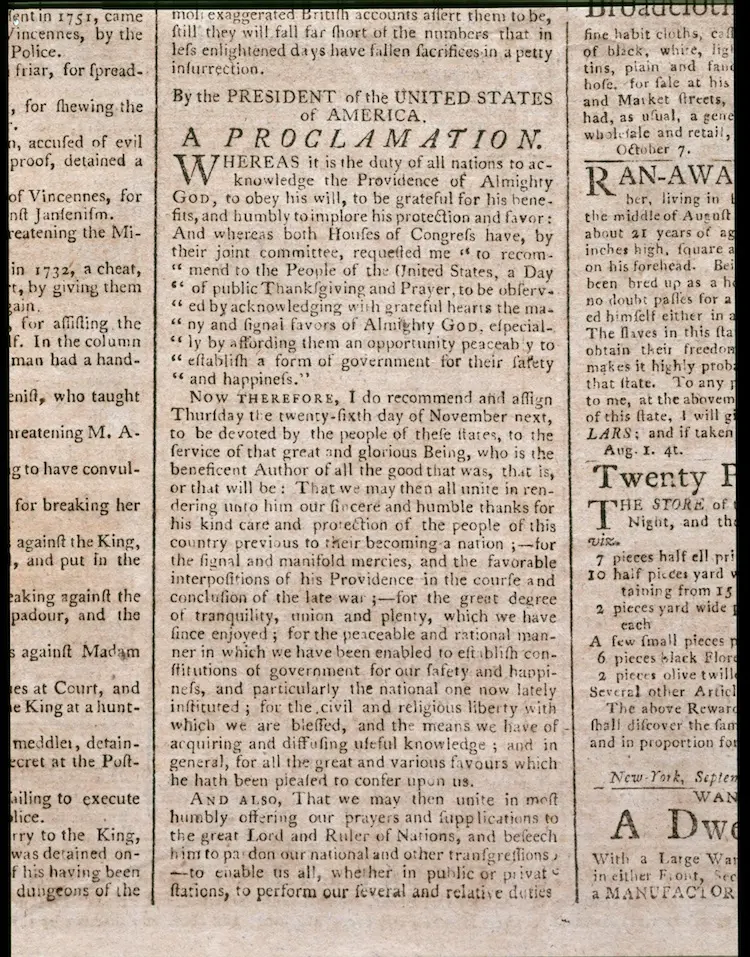 In 1789, at the behest of Congress, America's first President, George Washington, issued a Thanksgiving Proclamation in which he recommended: "to the People of the United States a day of public thanksgiving and prayer to be observed by acknowledging with grateful hearts the many signal favors of Almighty God, especially by affording them an opportunity peaceably to establish a form of government for their safety and happiness."