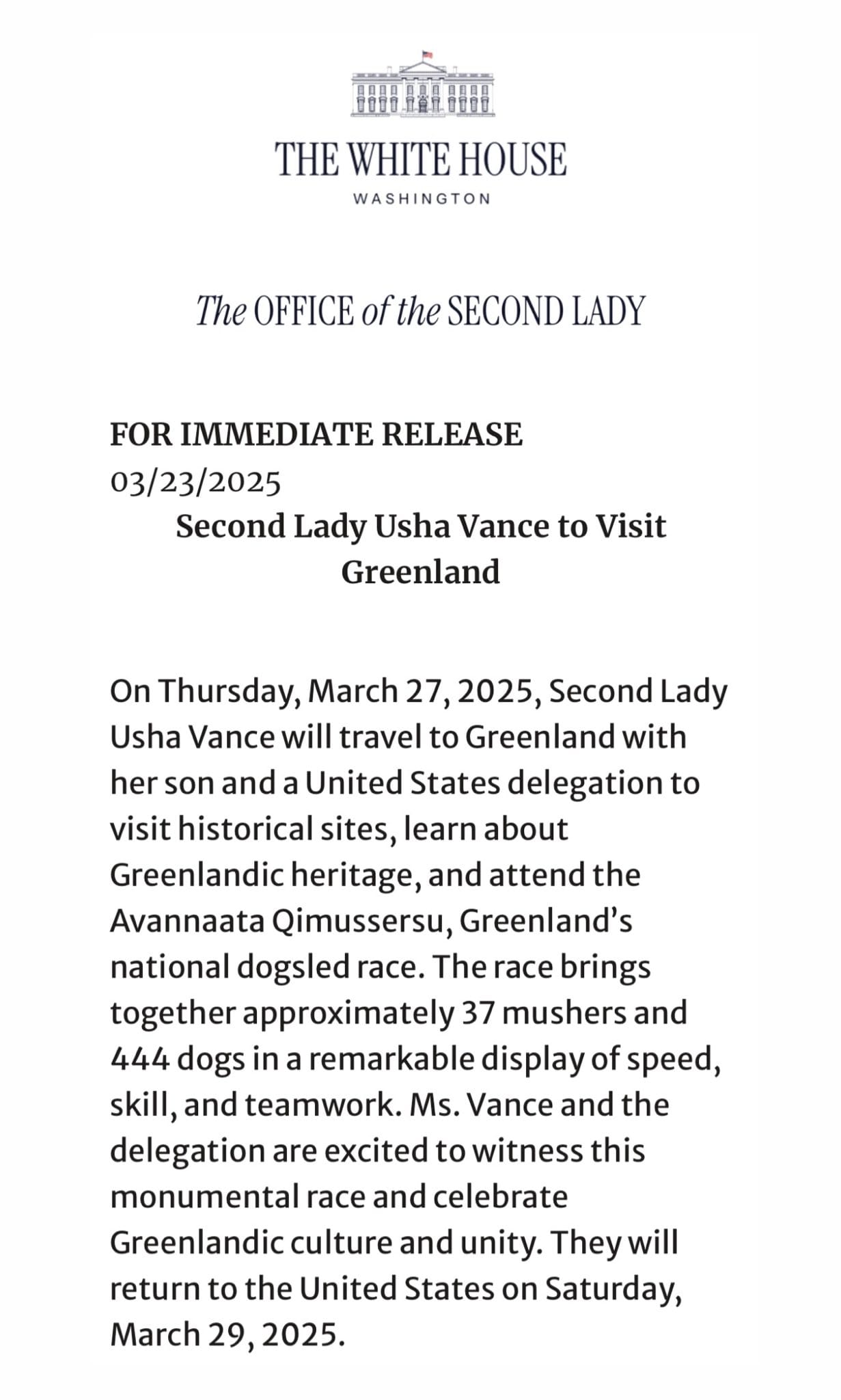 Second Lady Usha Vance, wife of U.S. Vice President J.D. Vance, is set to visit Greenland this week as part of a U.S. delegation that includes National Security Adviser Mike Waltz and Energy Secretary Chris Wright. The three-day trip, beginning Thursday, will feature visits to historical sites, cultural learning, and the national dog sledge race, Avannaata Qimussersu, according to a statement from the White House.