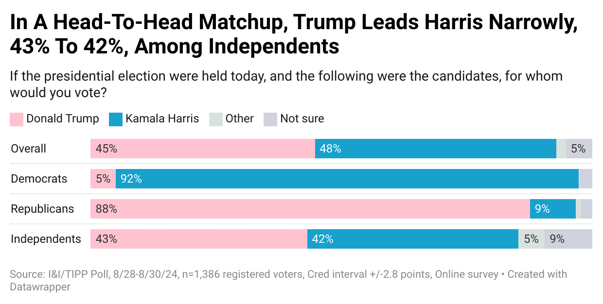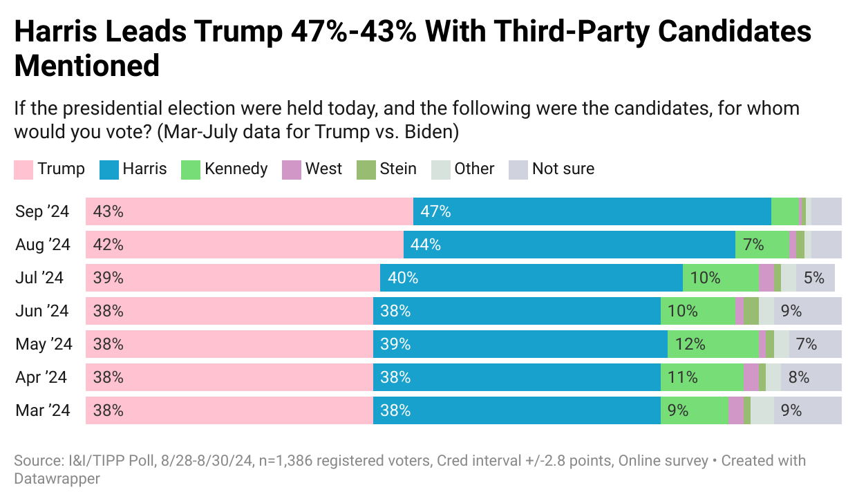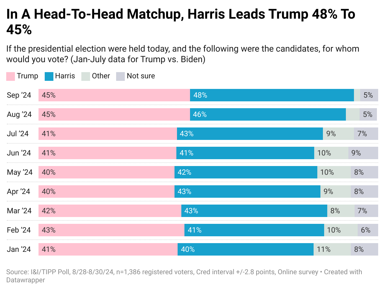 In a head-to-head matchup, Harris holds a 48% to 45% advantage over Trump in the September I&I/TIPP Poll, with 1,386 registered voters answering the survey from Aug. 28-Aug. 30. The poll has a margin of error of +/-2.8 percentage points.