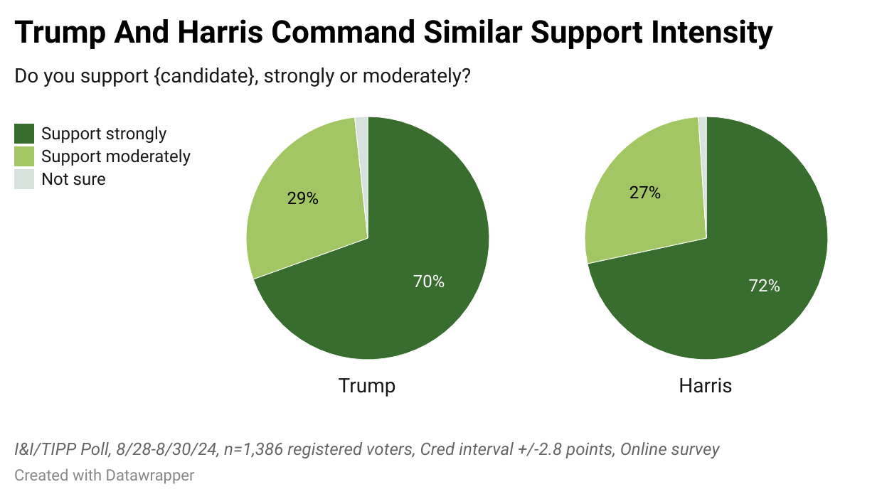 One other way of gauging whether voters will show up at the polls or not is to ask how strong they support their candidate. Here again, the candidates are neck-and-neck. Some 70% of Republican voters say they support Trump "strongly," while 29% support him "moderately." For Harris, the comparable numbers are 72% and 27%, no real statistical difference.