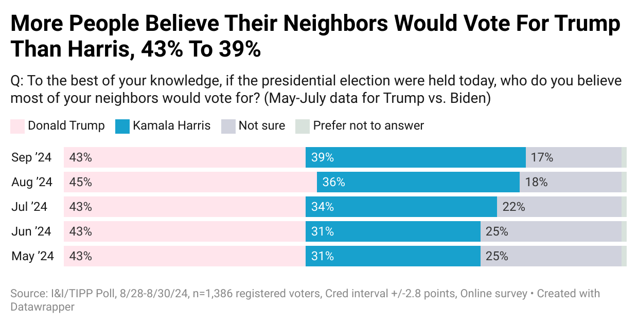 The intent here is to get at a hidden preference or belief by voters of all stripes. Again, the results are enlightening: Overall, 43% respond Trump, while 39% answer Harris, and 17% aren't sure.