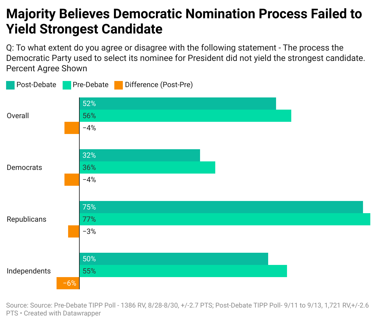 After the debate, things changed a bit, but not much: 26% of Dems still said they had lost faith in their party, while 67% said they hadn't. For Republicans, 78% agree, 15% disagree. Indies came in at 49% agree to 38% disagree.