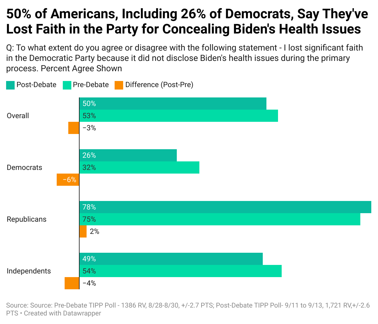 Finally, I&I/TIPP asked voters for another "agree/disagree" response: "I lost significant faith in the Democratic Party because it did not disclose Biden's health issues during the primary process."